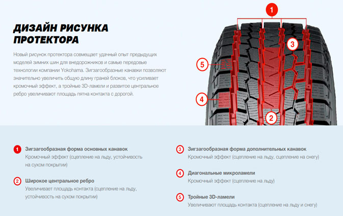 В немалой степени улучшить сцепление на зимних покрытиях удалось за счет многофункциональности канавок, пролегающих между блоками и ребрами протектора. Помимо дренажа эти элементы выполняют и другие функции. В частности, продольные канавки зигзагообразной формы, обеспечивая пятно контакта дополнительными кромками, улучшают сцепление на обледенелой поверхности. Кроме того, такой дизайн в местах их пересечения позволяет протектору лучше цепляться за заснеженное покрытие, благодаря возможности захватывать и удерживать снег.